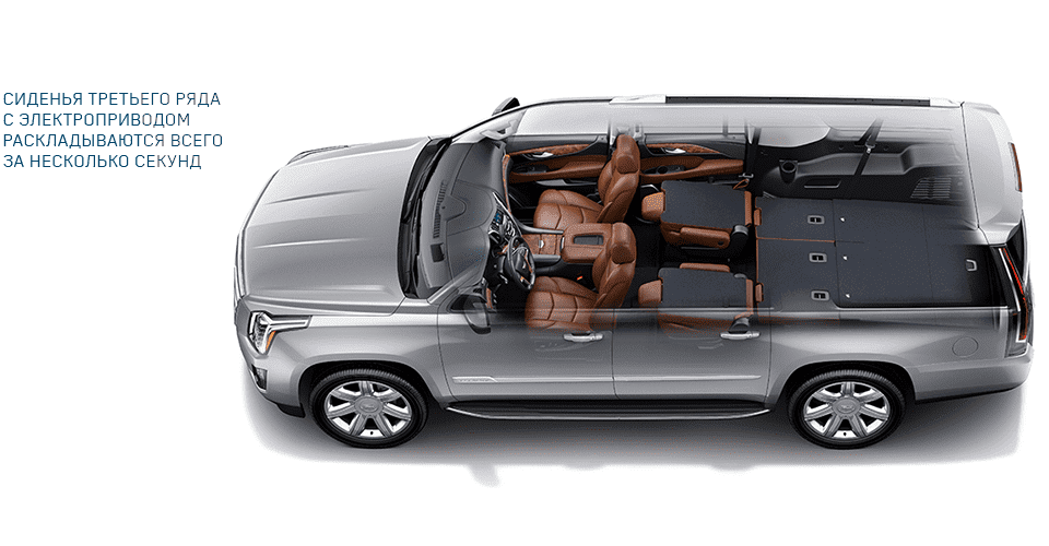 Cadillac Escalade ESV продуман до мелочей. Он на 50 см длиннее не только потому, что размер производит впечатление. Восемь человек комфортно размещаются в салоне автомобиля – пассажиры на сиденьях третьего ряда получают достаточно свободного пространства. Когда сиденья второго и третьего ряда находятся в сложенном виде, в автомобиле доступно 3424 л багажного пространства. Это на 757 л больше, чем в Cadillac Escalade со стандартной базой, а объем свободного места за третьим рядом сидений достигает 1113 л. Мы готовы пойти на всё ради вашего максимального комфорта, поэтому уделили задним дверям нового ESV особое внимание: они больше по размеру и широко открываются, упрощая посадку.